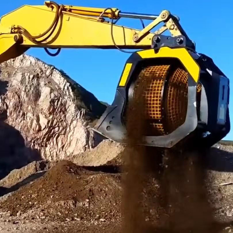 破碎斗筛分斗可以一步一步地跟随施工进度。只需将其安装在施工现场的挖掘机上,无需任何运输费用。直接作业于从挖掘中获取的材料,运用破碎斗,粉碎斗破碎成所需的大小,筛分斗、筛分铲斗进行筛分。如此一般,可沿着整个施工现场作业。