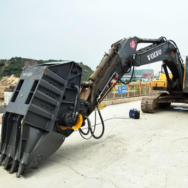 破碎斗采用先进的液压技术,使用马达转动带动颚板将混凝土,石块等挤碎,使达到设定要求的碎料从排料口吐出,小于排料口的钢筋在也可以同时从排料口排出。