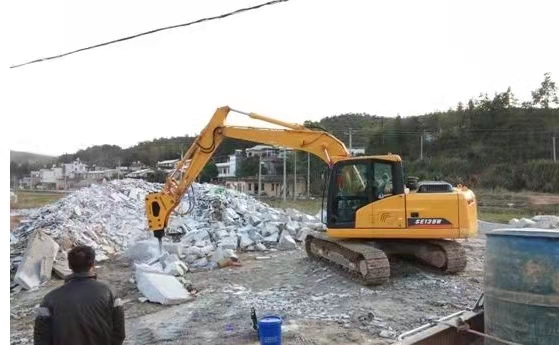 (4)当破碎特别坚硬的物体时,应先从边缘处开始,不要在同一点上连续敲打超过1min,以防止钎杆烧毁或液压油过热。